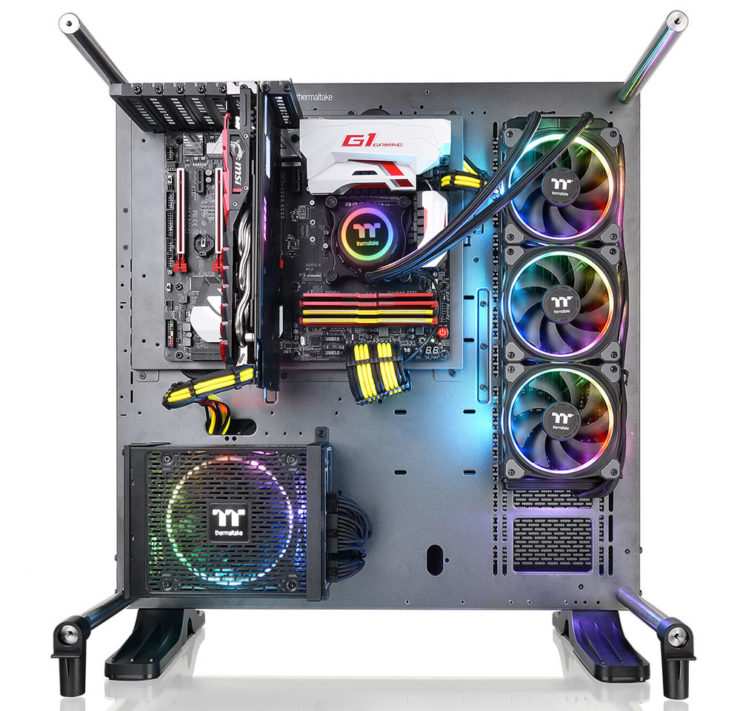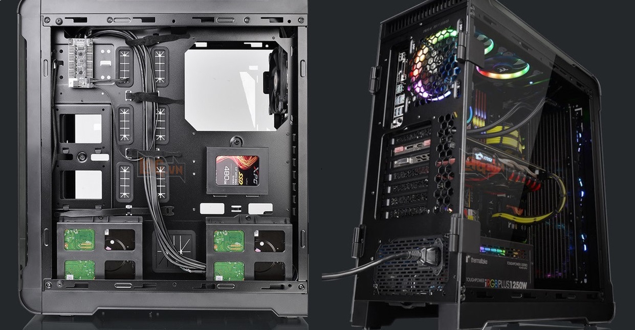 Đây là chiếc case full-tower với kính cường lực dày cho độ bền cao. Thermaltake tích hợp tới 8 giá đựng ổ đĩa 3.5/2.5", 2 giá 5.25' dành cho ổ đĩa quang hay fan controller. Chiếc case này có thể nhét vừa mọi loại bo mạch chủ, ngay cả E-ATX, hỗ trợ nguồn dài 220mm, card đồ họa dài 480 mm (không có giá ổ đĩa 3.5/2.5" chắn ngang), tản nhiệt khí cao đến 185 mm. Thermaltake còn trang bị thêm 1 CPU Riser để dựng đứng card đồ họa, rất thích hợp để "khoe" linh kiện này trong hệ thống tản nhiệt nước custom mà case này nhắm tới. Cuối cùng, chiếc case gắn sẵn 3 quạt 140 mm và hỗ trợ rad 420 mm.